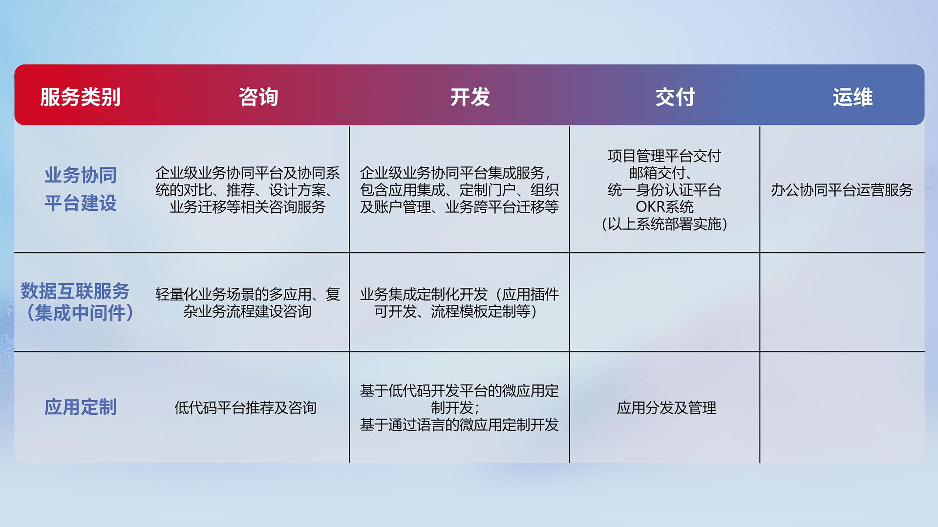 针对钉钉、、、、企微、、、、IDaas等平台级产品提供产品的规划、、、、方案、、、、交付、、、、定制化开发等服务,,实现如统一协同办公、、、智能客户服务、、、混合会议管理、、、智能数据查询、、、、等业务场景,,实现数字化转型。。。。