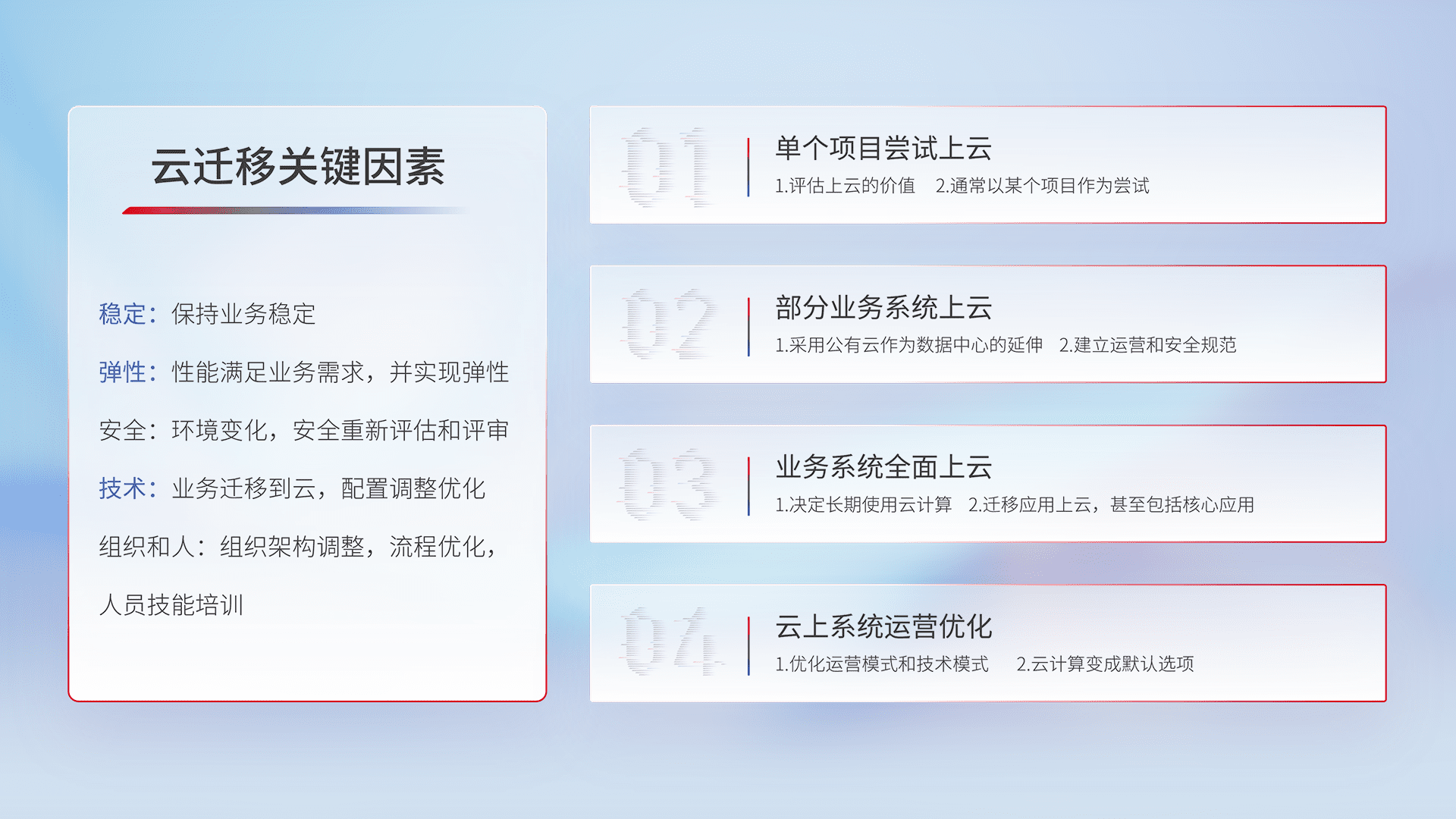 结合实际业务,,从规划设计、、云平台选型、、、、云原生改造、、、、数据迁移、、集成交付,,迁移全过程为客户识别最佳上云路径,,做好风险识别管理,,设计网络架构、、、、身份权限、、、、安全审计合规、、、操作审计、、日志审计、、监控告警策略、、多站点容灾设计等,,,,对云上基础设施进行整体规划,,提升IT治理水平,,,以满足弹性、、、、高可用、、、、高性能的需求。。。。