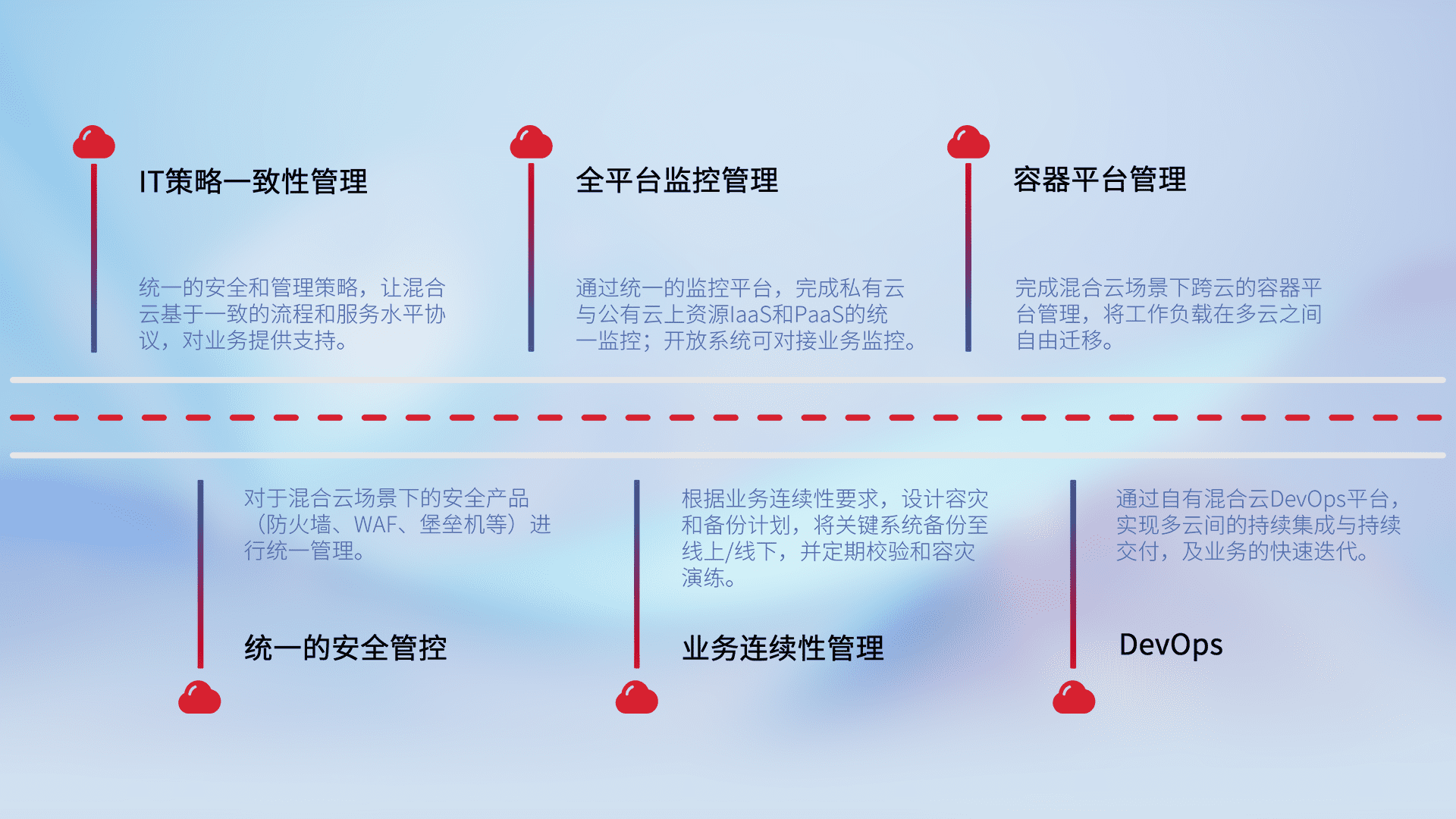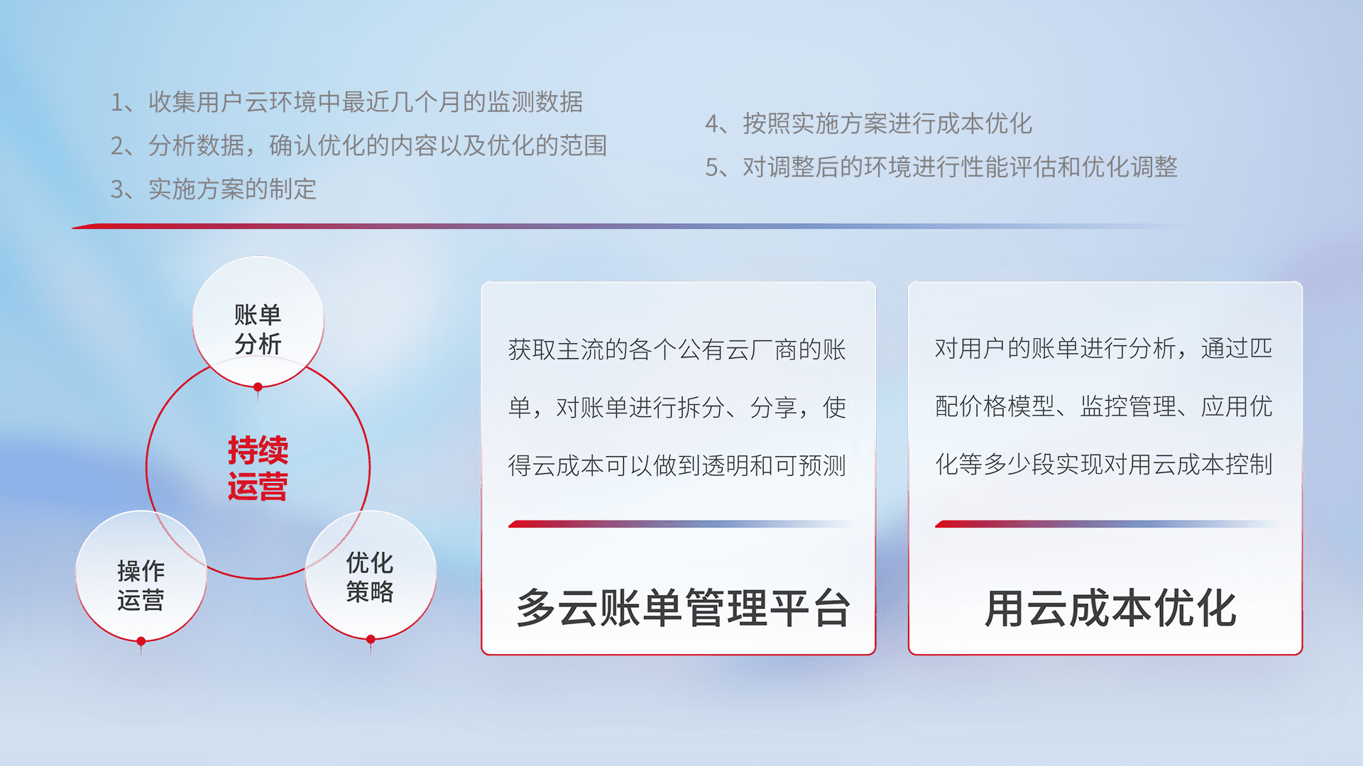 通过多云纳管,,,,以统一的资源数据模型把客户的云资源进行抽象和封装,,,,进而实现对多云资源的统一操作,,,保障云资源管理的可靠性、、稳定性与可用性。。量身定制化运维内容,,配置、、、开发运维、、补丁管理、、、、备份、、、监控、、认证和访问管理、、、、审计和日常巡检等,,,,保障在用云过程中的可靠度,,稳定度以及高可用率。。